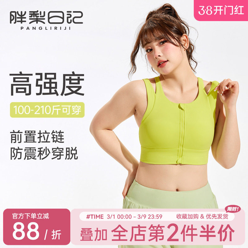 胖梨日记前拉链大码运动内衣女跑步防震高强度一体式胖mm健身文胸