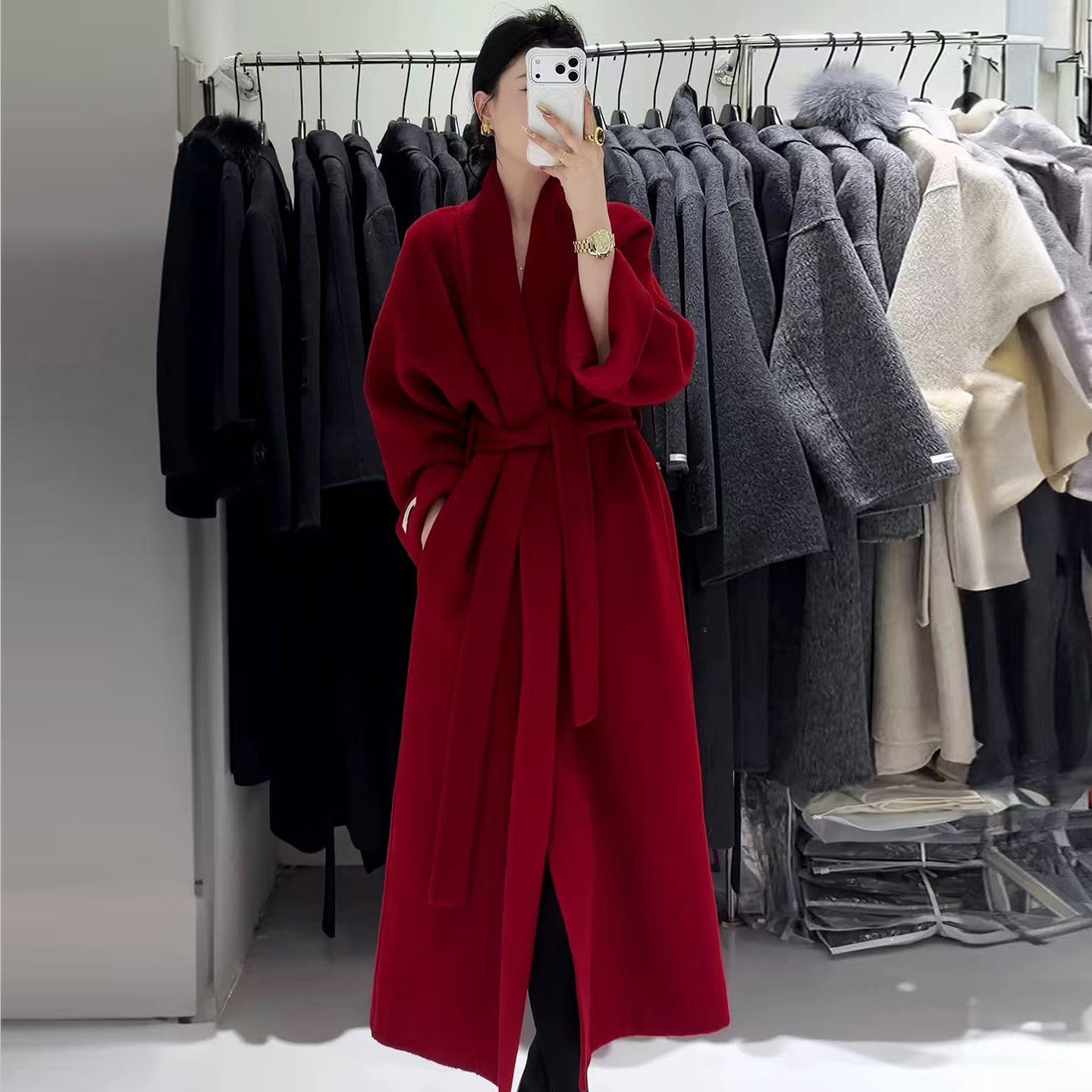 红色双面羊绒大衣女中长款收腰系带新娘结婚敬酒服新年毛呢外套女