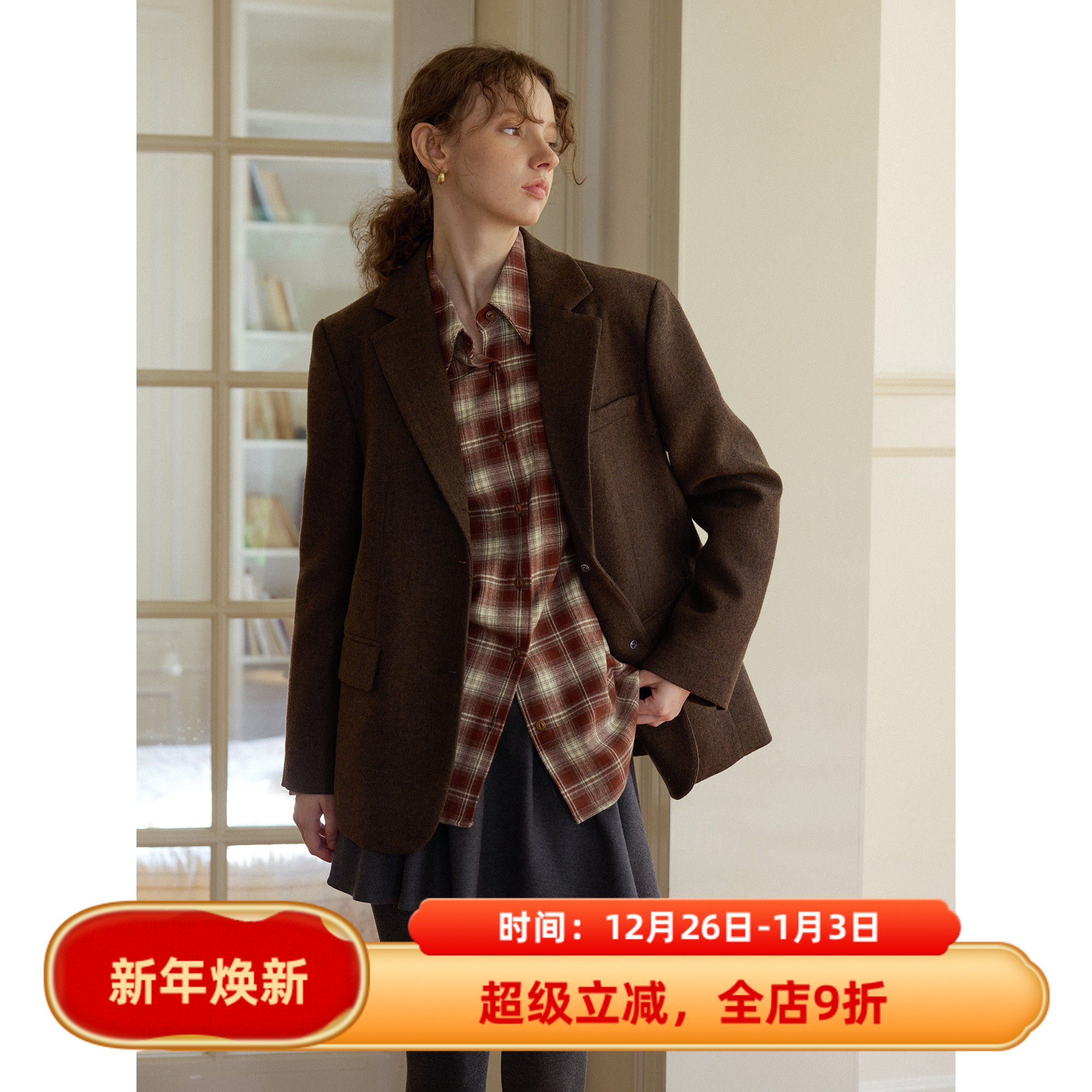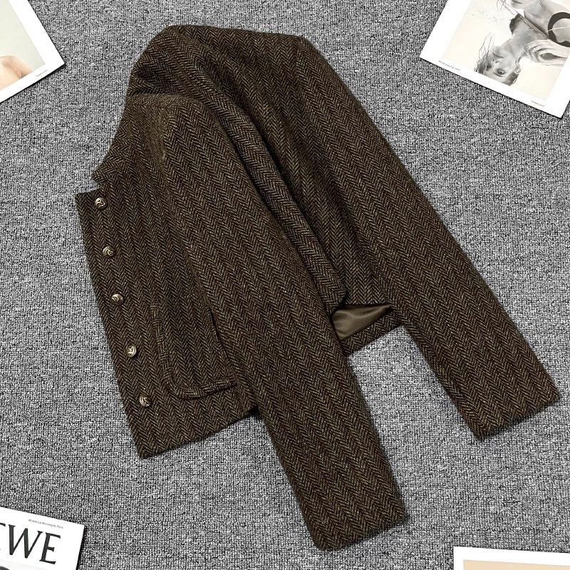 深咖色人字纹毛呢西装外套女2024年秋冬新款设计感休闲短款小西服