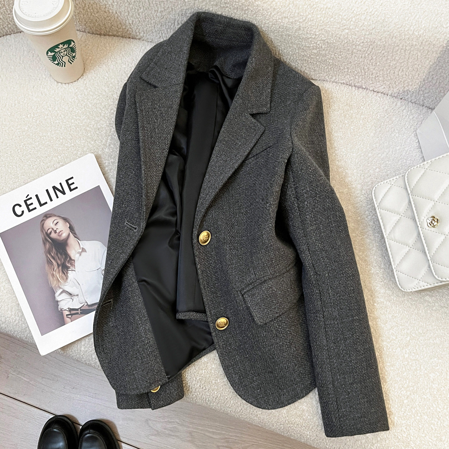灰色短款毛呢西装外套女2025新款秋冬季小个子复古英伦风气质西服