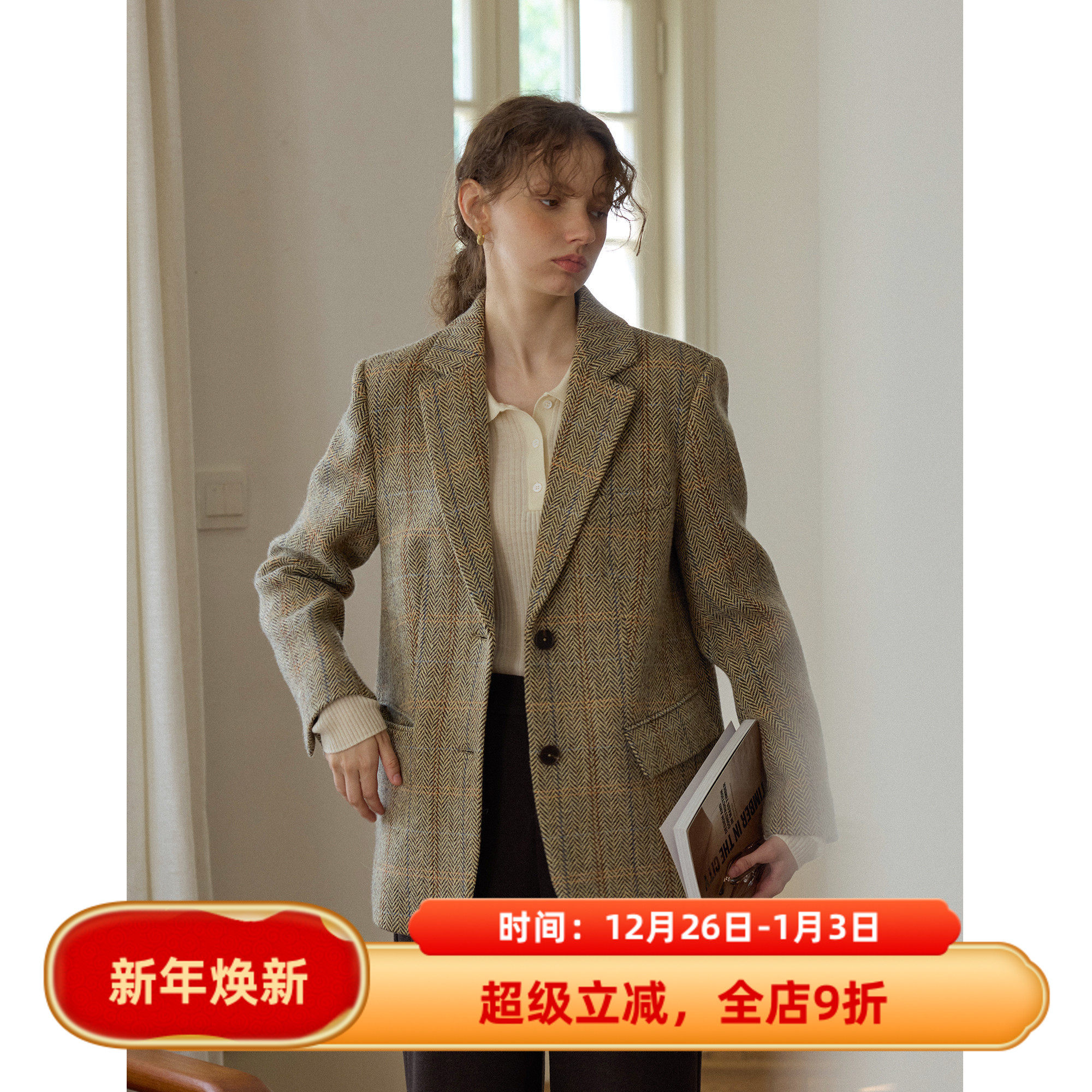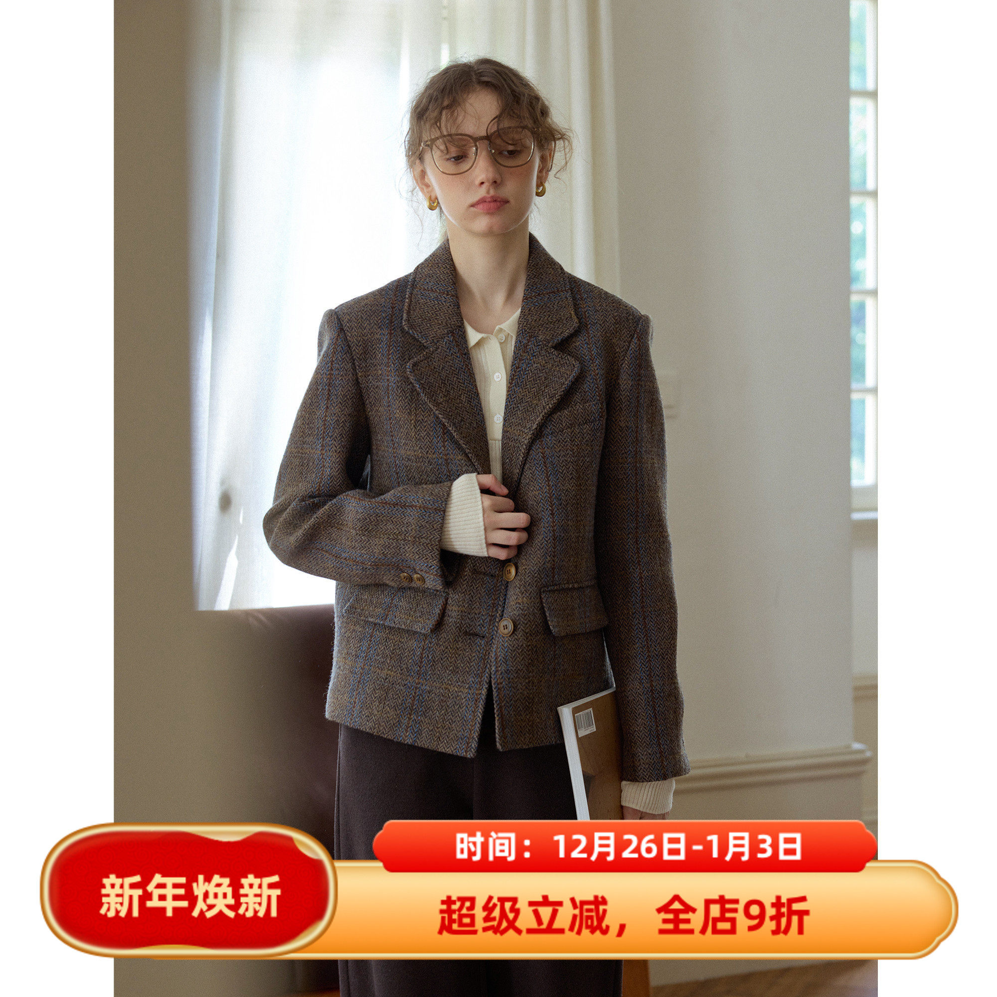 复古风格纹宽松短款羊毛毛呢西装外套女秋冬季新款呢子通勤小个子