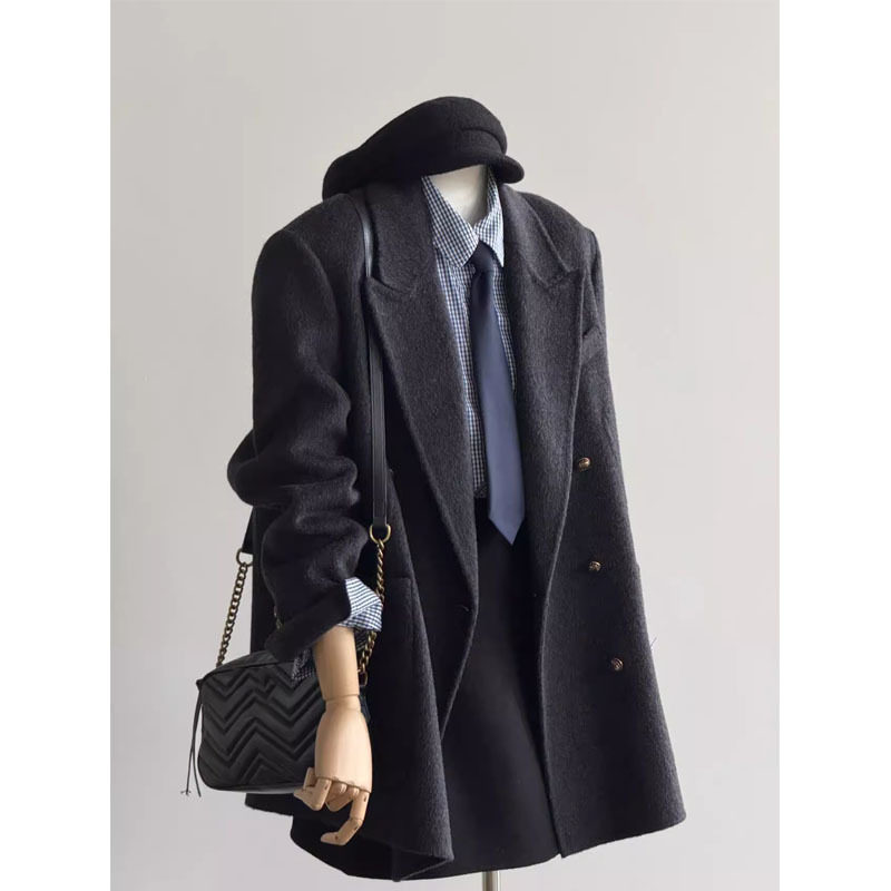 双面羊绒大衣女短款小西装黑色高端羊毛双面呢工装小个子毛呢外套