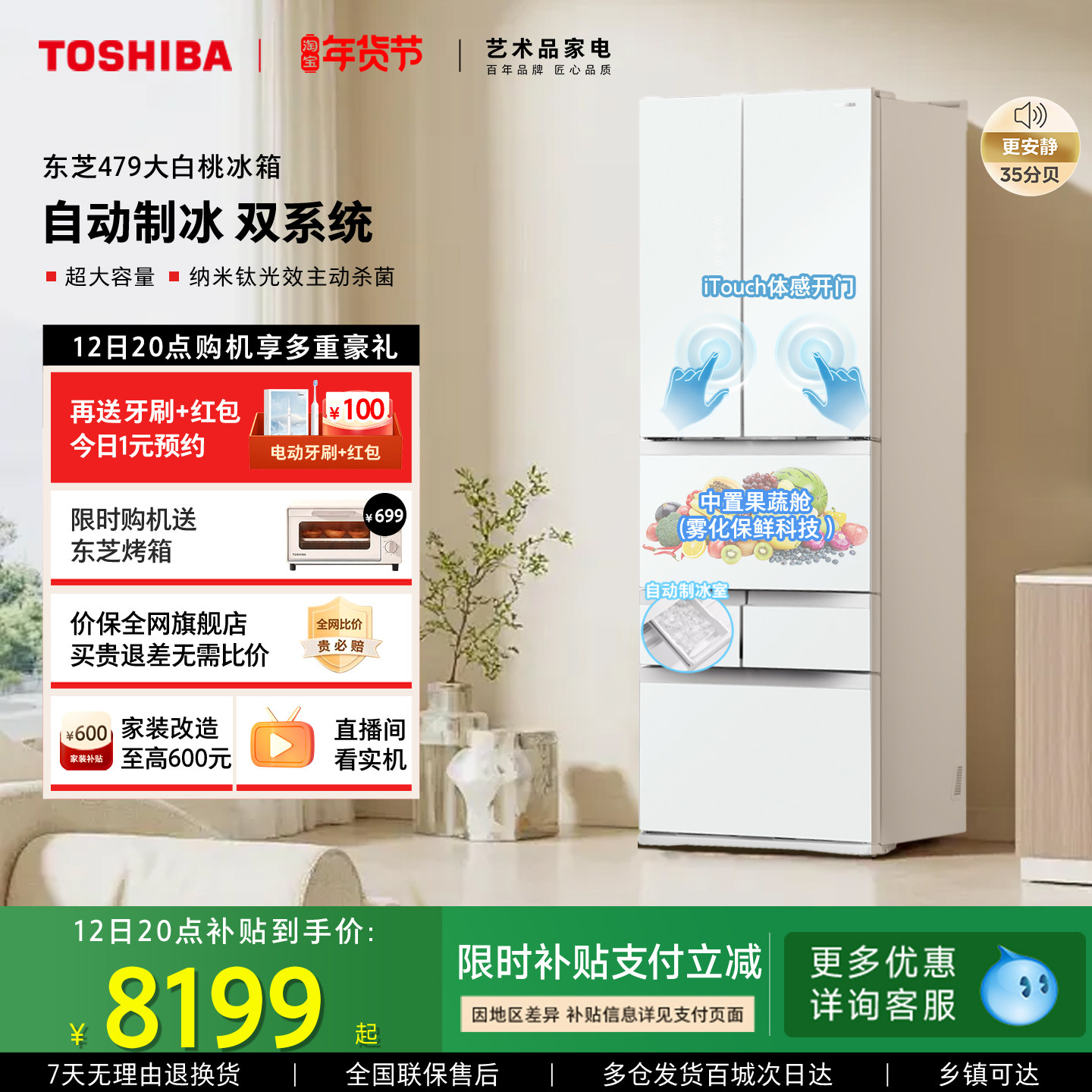 东芝小白桃429小户型大容量变频风冷无霜家用自动制冰多门冰箱