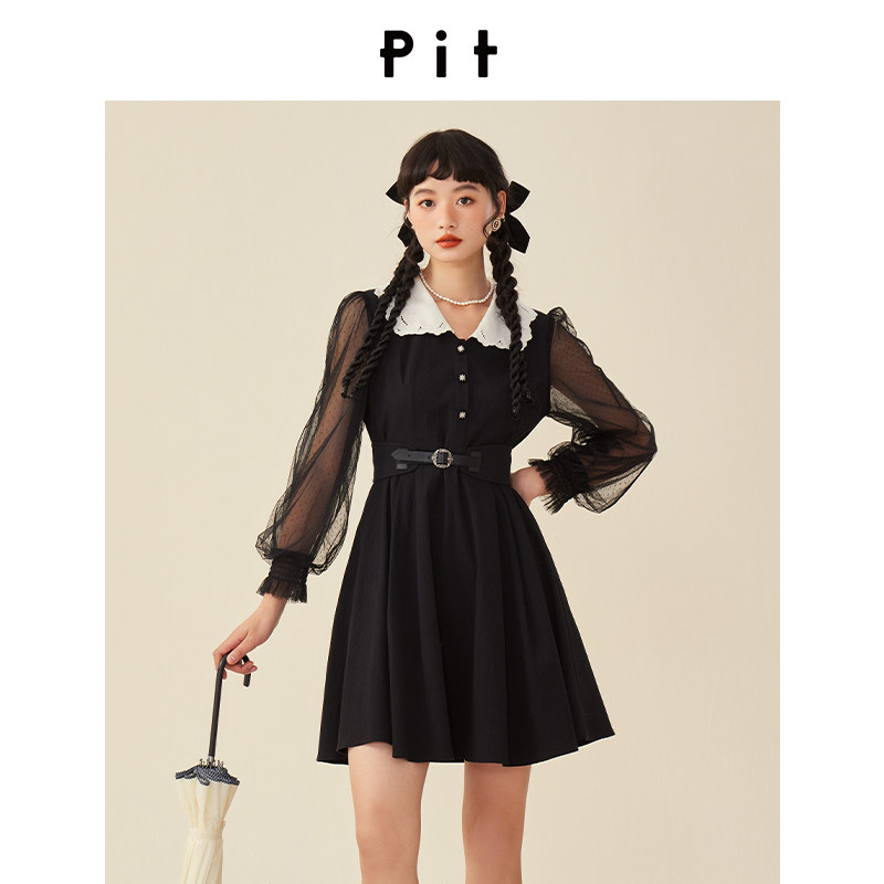 【昕怡粉丝专享】pit复古法式蕾丝拼接腰带黑色收腰长袖连衣裙女2