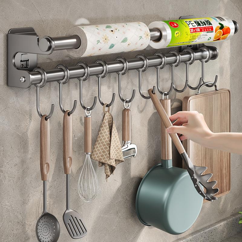 吸盘厨房挂钩厨房置物架挂杆免打孔锅铲勺子一排挂架不锈钢收纳架
