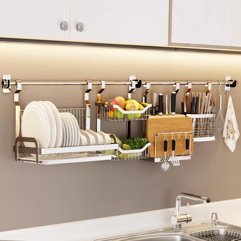 多功能厨房挂架壁挂式墙面置物架免打孔刀架304不锈钢碗碟沥水架