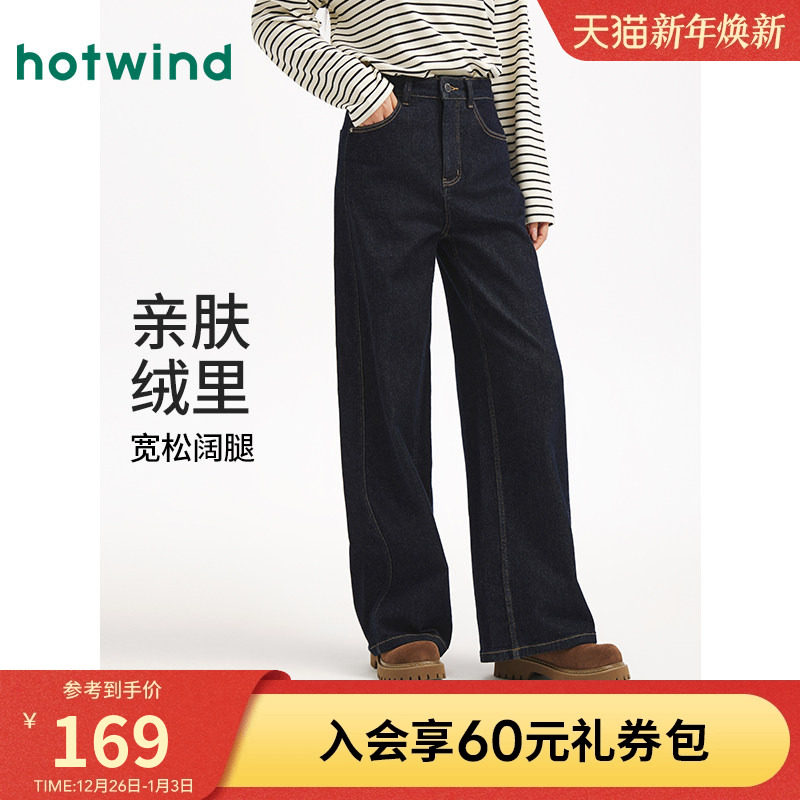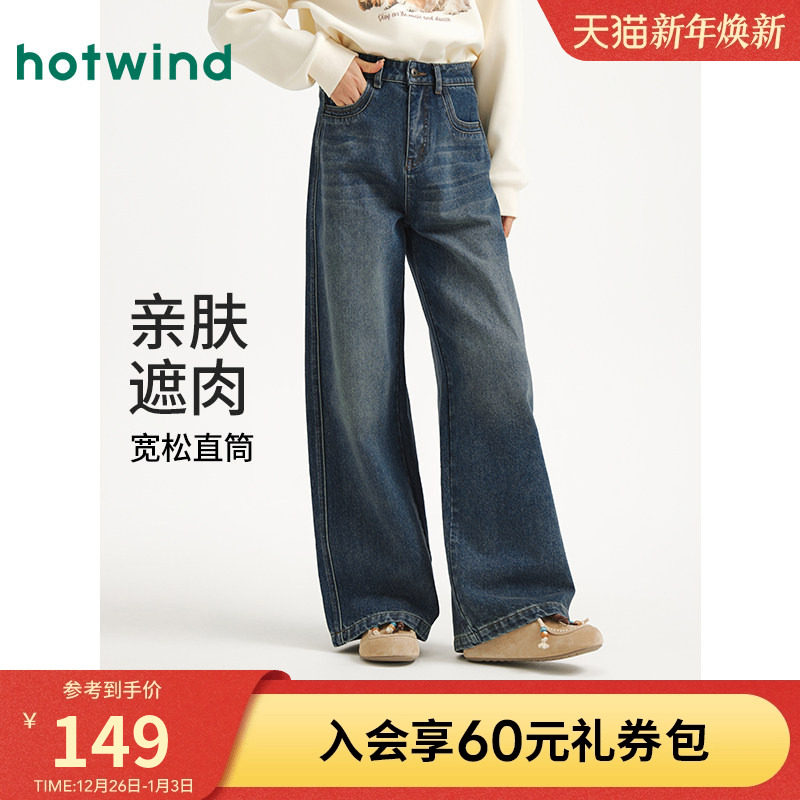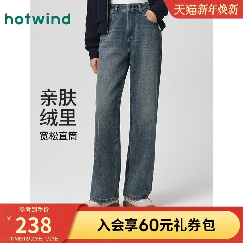 热风女士直筒加绒牛仔裤2025年秋季新款复古做旧阔腿显瘦牛仔裤