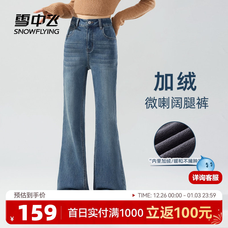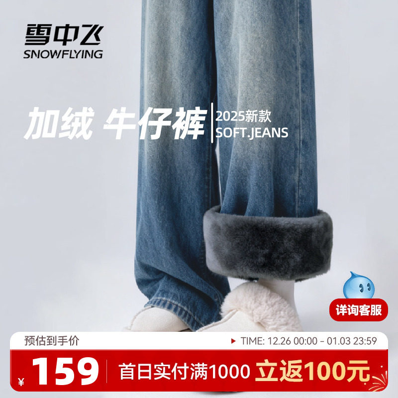 雪中飞加绒牛仔裤女秋冬2025新款保暖阔腿裤小个子高腰显瘦裤子PC