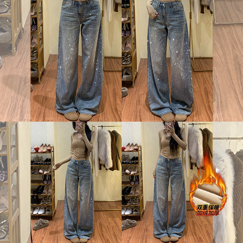 - 直筒加绒加厚牛仔裤女
