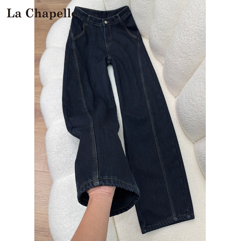 拉夏贝尔喇叭裤女显瘦裤子小个子深蓝高腰微喇牛仔裤加绒秋冬新款