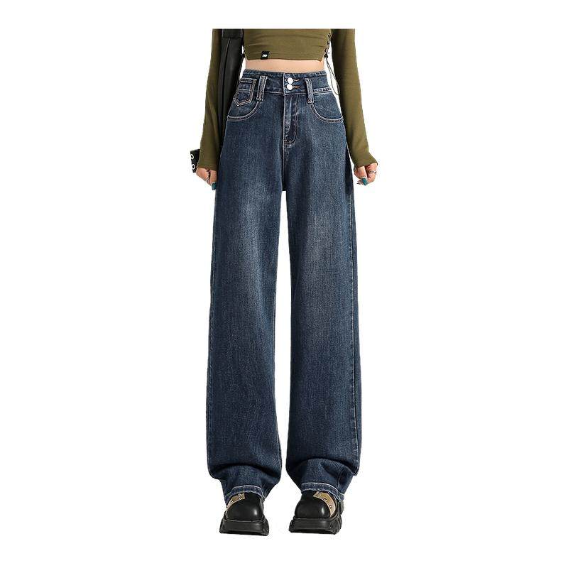 丹宁蓝阔腿牛仔裤女2025年秋冬新款加绒流行爆款高腰弹力宽松直筒