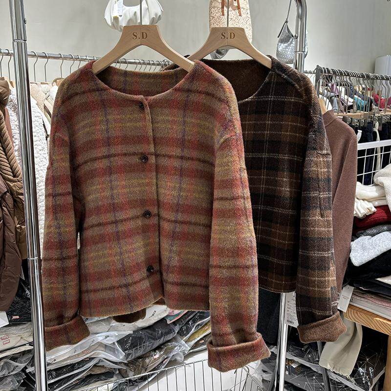 春秋新款小香风格子圆领双面羊毛大衣女士单排扣羊绒短外套欧洲站