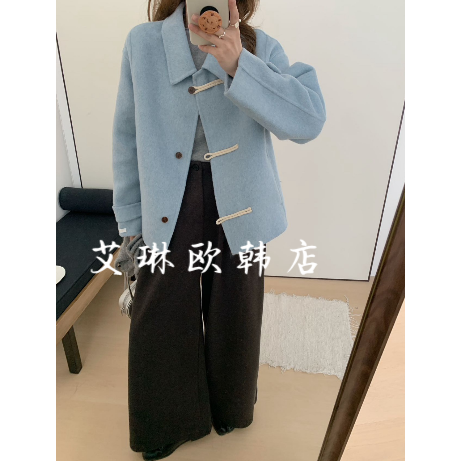 2.4~1060春季新韩系翻领盘扣100%澳洲超细羊毛大衣双面羊绒短外套