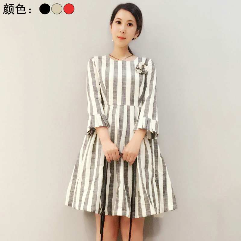 国内品牌 春H秋装文艺范喇叭袖显瘦竖条纹透气棉麻中长款连衣裙