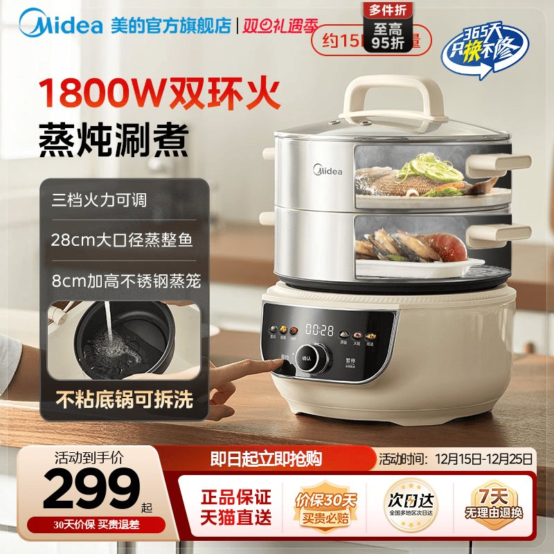 美的电蒸锅家用2025新款不锈钢蒸笼多功能蒸煮一体锅底锅可拆洗
