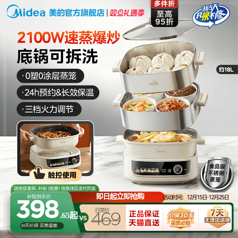 美的电蒸锅小型多功能家用三层蒸笼蒸锅煮锅一体蒸馒头包子早餐机