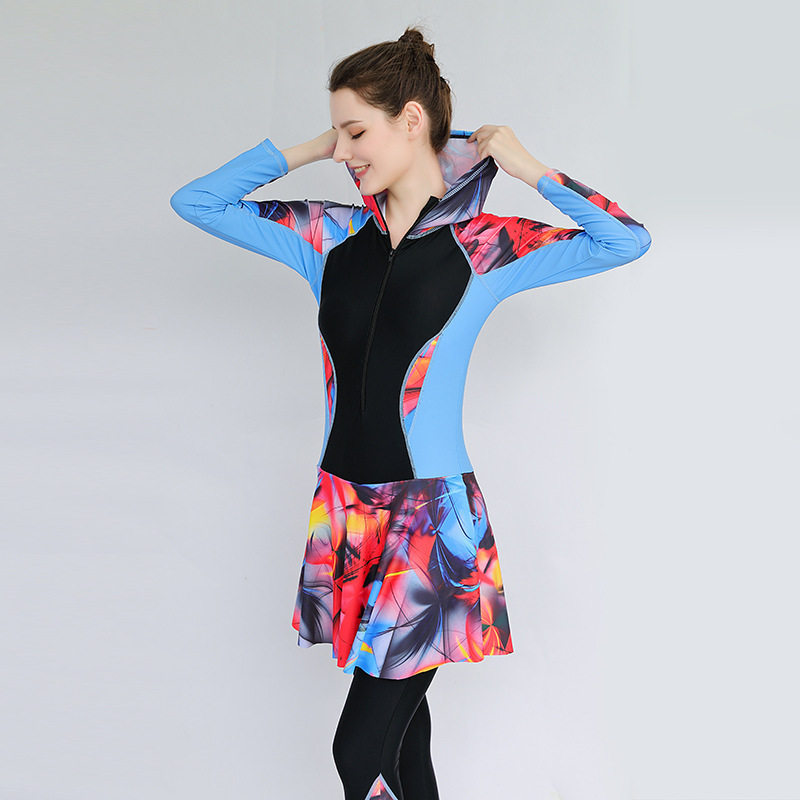 全身防晒泳衣女保守裙式连体连帽大码长袖长裤显瘦遮肚温泉潜水服