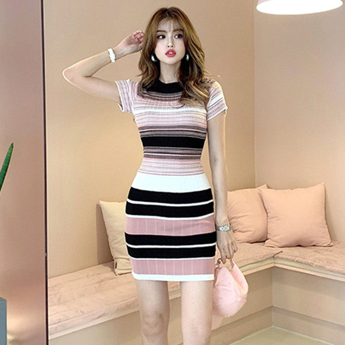 韩国东大门女装夏季时尚新款修身显瘦包臀短裙内搭条纹针织连衣裙
