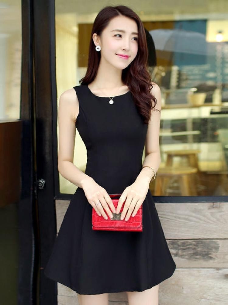 STU现H25夏款韩国东大门纯色简约百搭无袖收腰爱心扣连衣裙短裙女