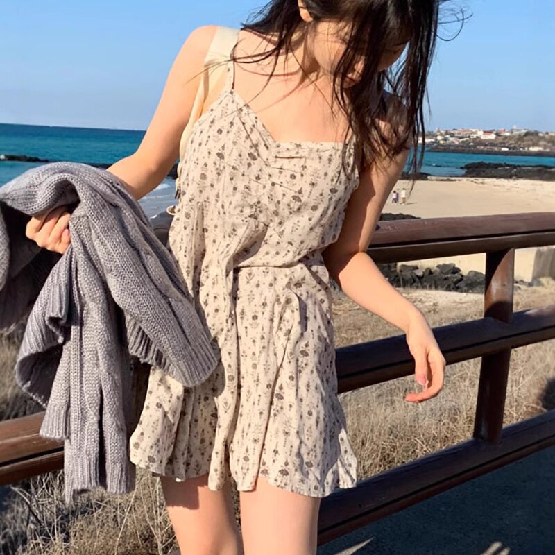 oinii现H25夏款韩国东大门法式复古度假风吊带短裙连衣裙碎花裙女