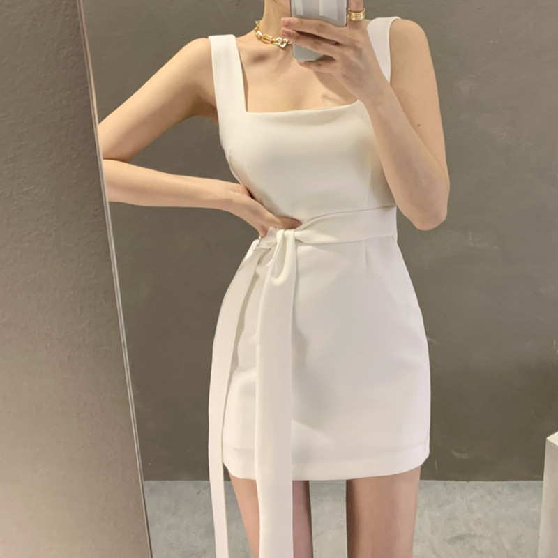 韩国chic夏季复古洋气U领褶皱感收腰显瘦无袖吊带背心连衣裙短裙