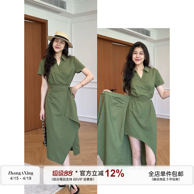 CHENXIAN辰现棉麻围裹系带设计感短袖连衣裙收腰显瘦中长款裙子女