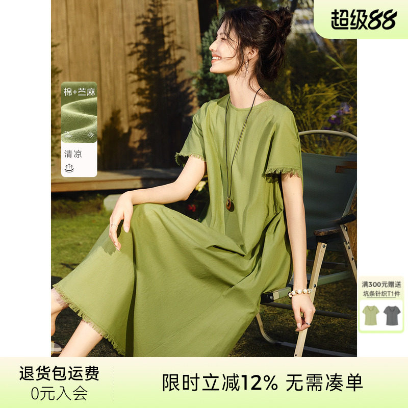 XWI欣未含苎麻棉麻芥绿流苏系带收腰连衣裙女夏季短袖绿色中长裙
