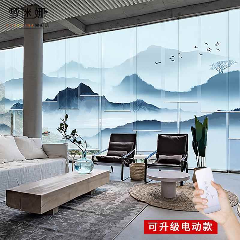 新中式办公卷帘窗帘免打孔软隔断屏风遮光帘子悬挂式电动升降挂帘