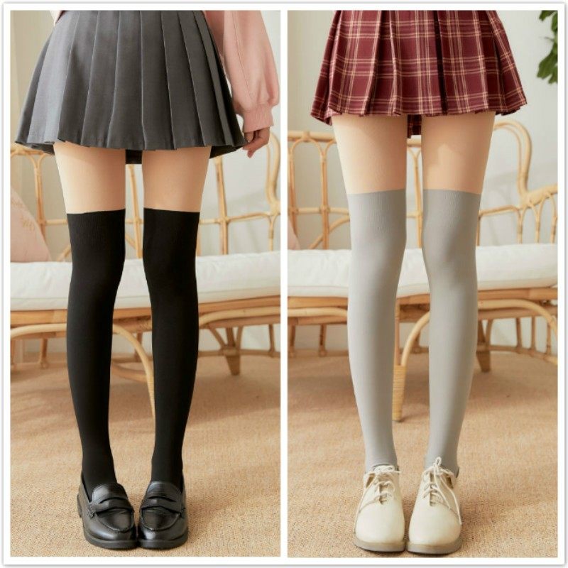 日系过膝丝袜拼色拼接女双色薄款大腿夏高筒假两件上肤下黑连裤袜