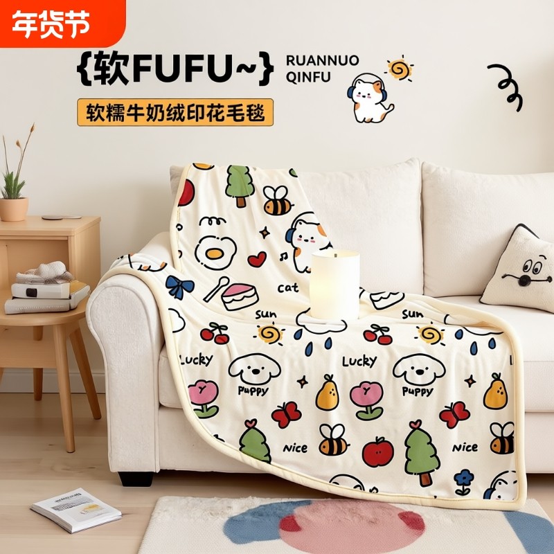 秋冬季拉舍尔毛毯盖毯被子可爱卡通风双层加厚不掉毛学生宿舍单人