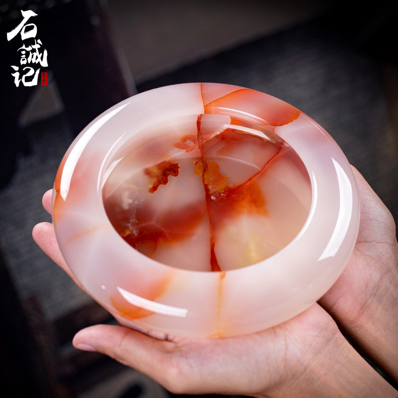 石诚记高档烟灰缸大理石家用客厅办公室创意礼品天然玉石臻品红花