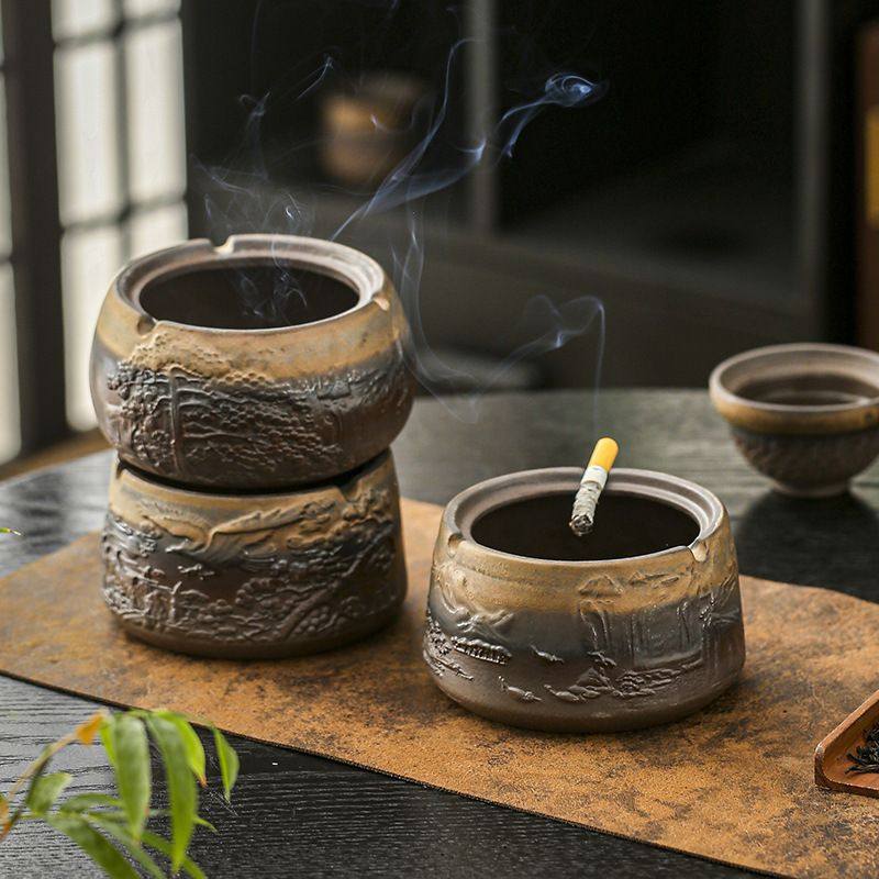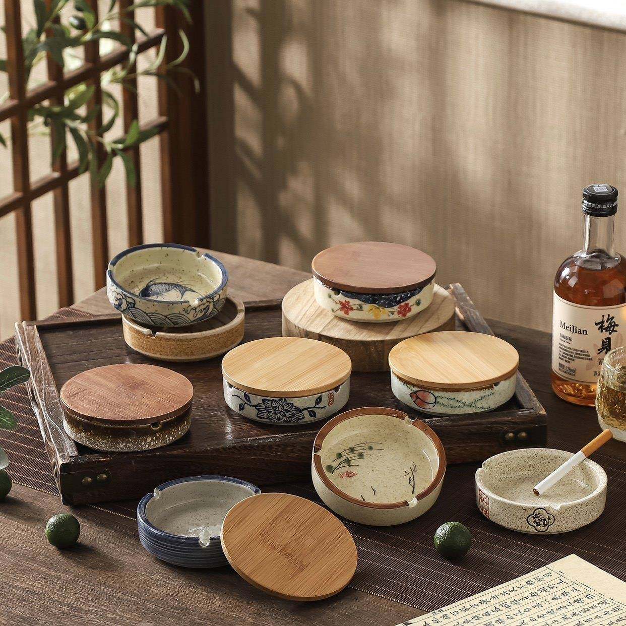 国风陶瓷烟灰缸防灰飞酒店茶室复古高档烟灰缸带盖家用客厅烟头缸