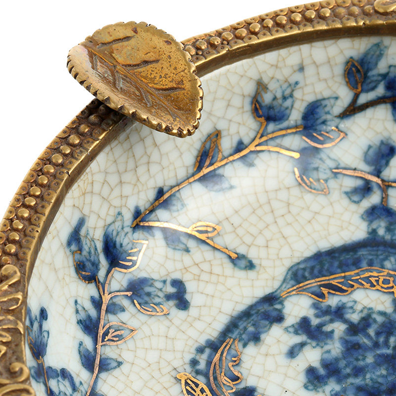 欧式高档烟灰缸美式客厅茶几家用装饰品陶瓷配铜青花瓷描金摆件品