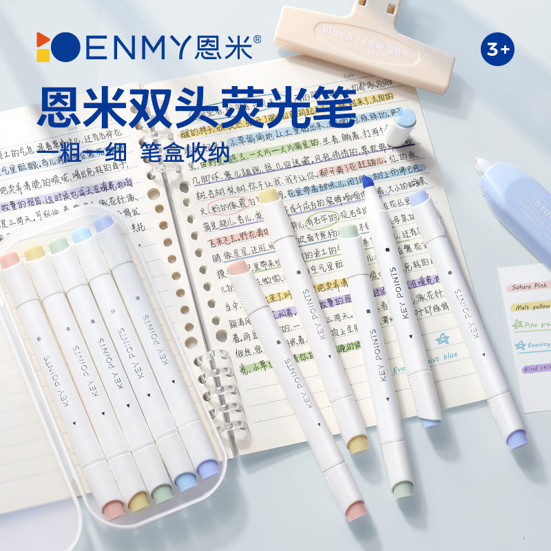 恩米双头荧光笔标记笔淡色系记号笔彩色划重点初高中生做笔记用高颜值ins风萤光小学生手账手抄报专用笔银光