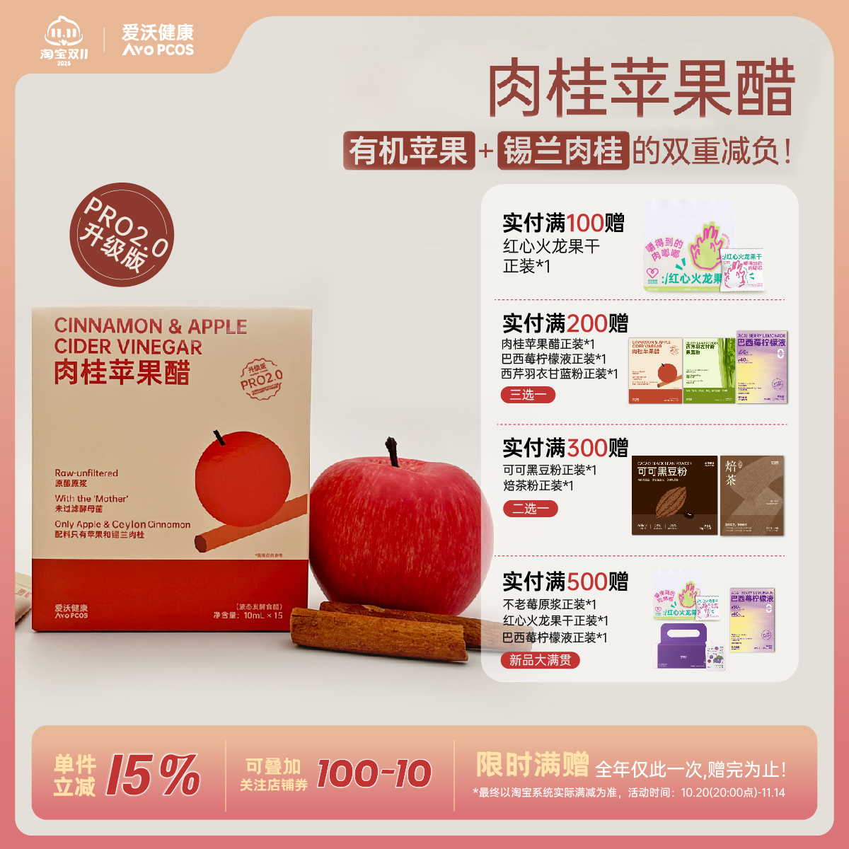 爱沃健康AvoPCOS升级版肉桂苹果醋肉桂粉苹果醋原浆苹果醋0糖0脂