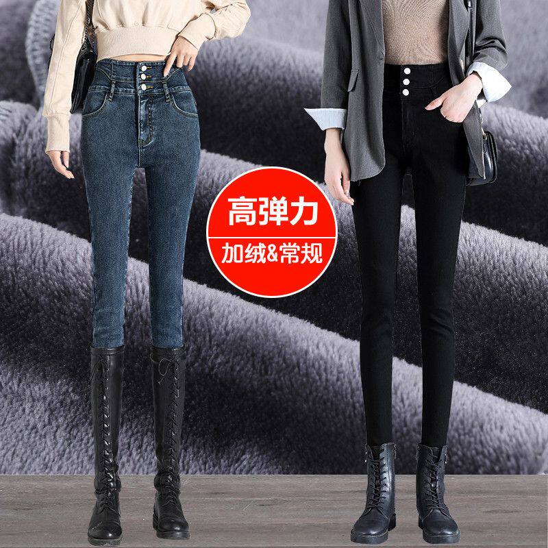 加绒牛仔裤女宽松高腰显瘦2021秋冬新款外穿百搭直筒弹力小脚铅笔