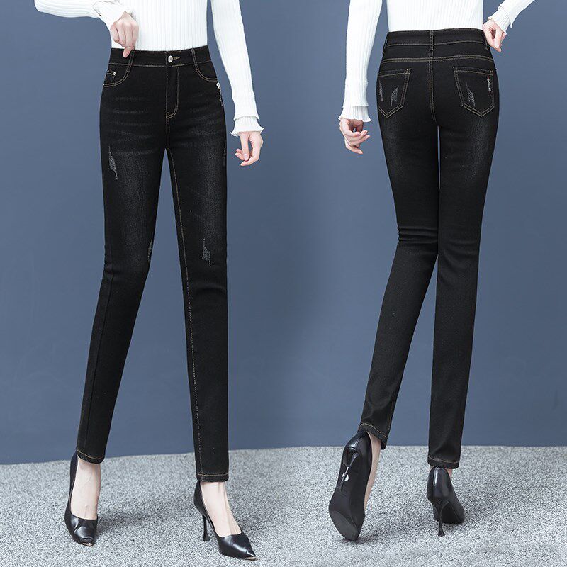 - 裤加绒小脚牛仔女黑色