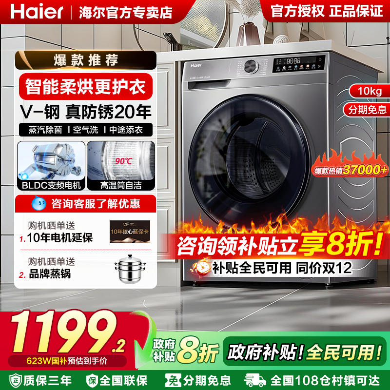 政府补贴海尔滚筒洗衣机全自动10公斤家用大容量统帅洗烘一体官方