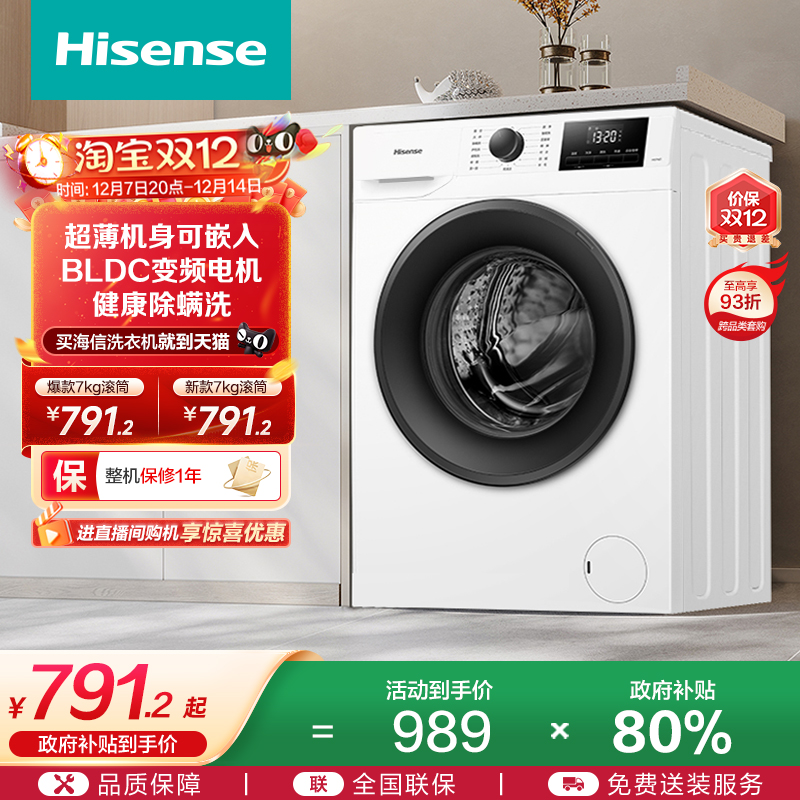 海信7公斤滚筒洗衣机全自动变频家用租房超薄洗衣机小型洗脱一体