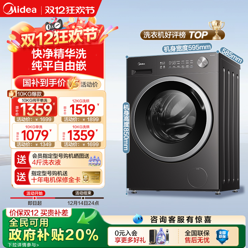 全民政府补贴美的12/10kg除菌全自动大容量洗脱烘一体滚筒洗衣机