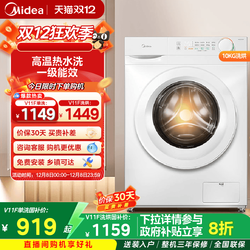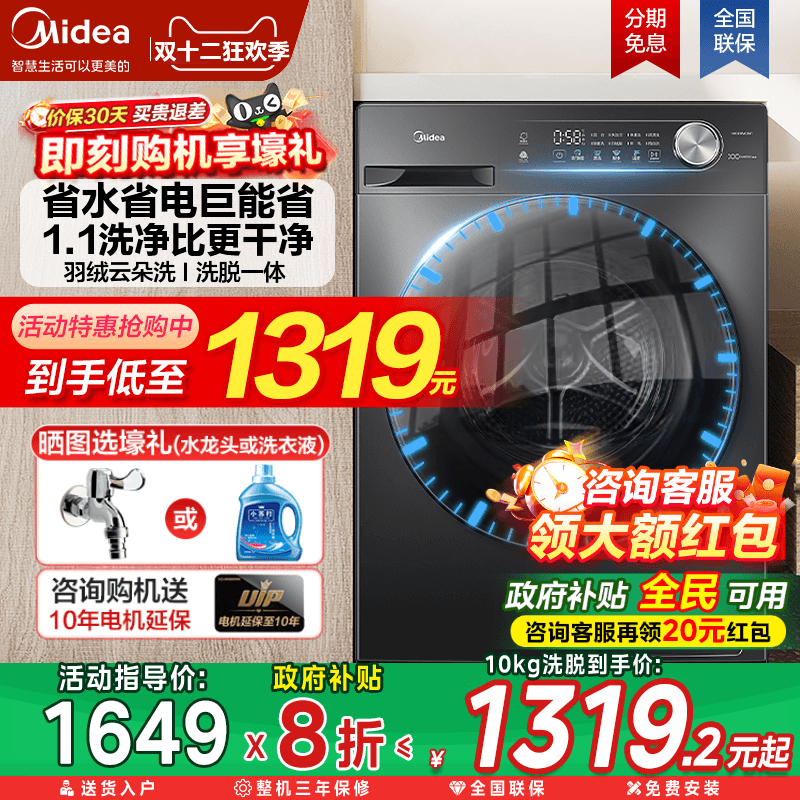 【全民补贴】美的10/12kg洗衣机1.1洗净比全自动除菌螨滚筒洗烘36