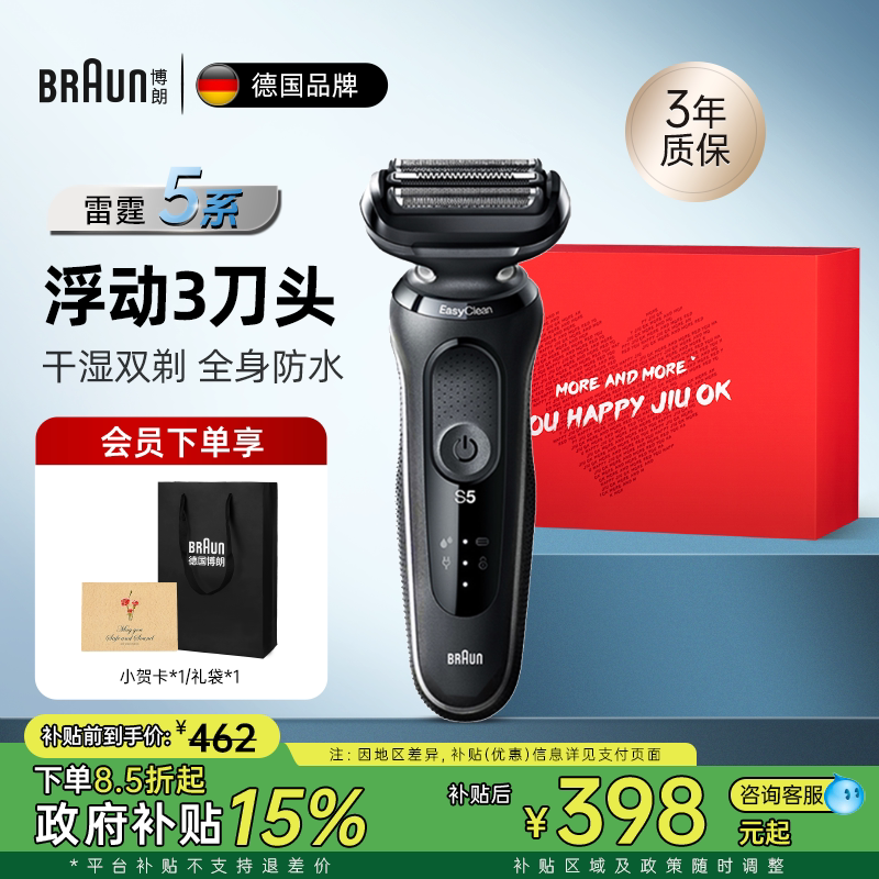 【政府补贴】博朗新品5系53-A10011s往复式快充电动剃须刮胡刀