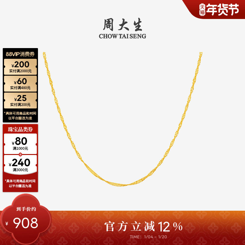 周大生黄18K金项链百搭彩金锁骨颈链水波纹麻绳素链女生新年礼物