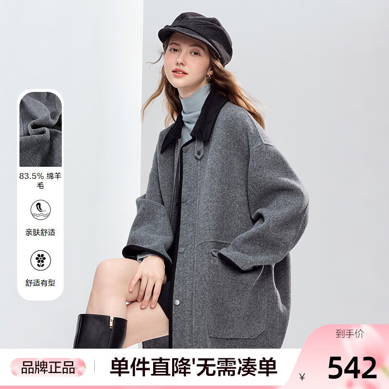 betu百图高级感灰色羊毛呢子大衣女2025年冬季新款双面毛呢外套