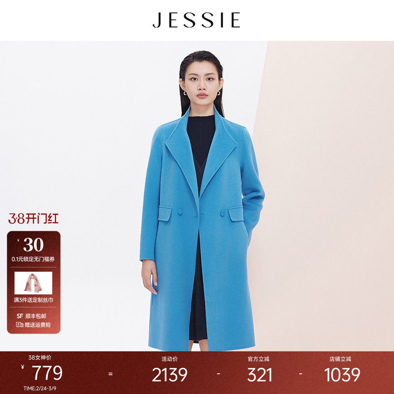 【商场同款】JESSIE蓝色中长款双面呢羊毛呢子大衣女冬季毛呢外套