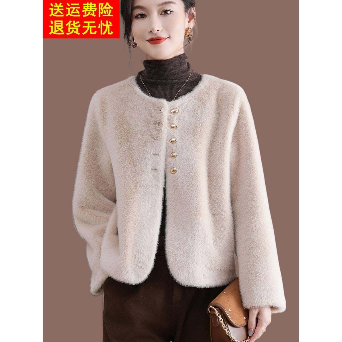 彷水貂绒外套女秋冬加厚外搭配旗袍连衣裙的海宁皮毛一体V领开衫