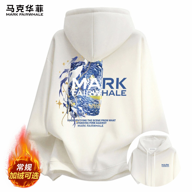 马克华菲白色连帽卫衣男款秋冬季新款加绒加厚男士长袖上衣服男装