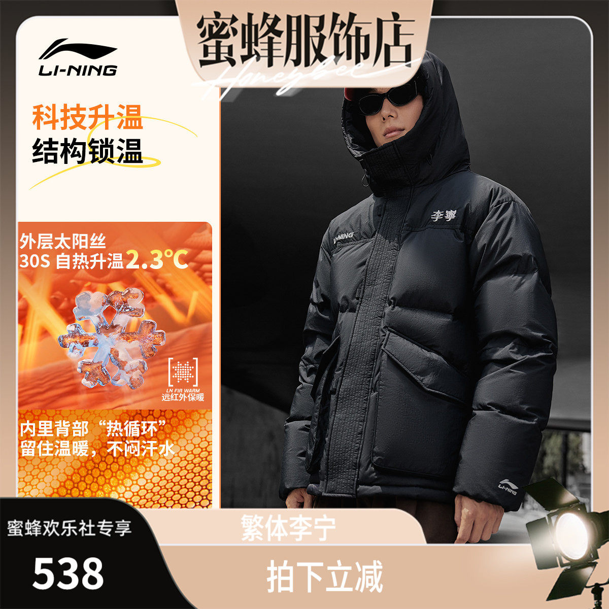 李宁火锅羽绒服丨热浪冬季情侣保暖面包衣服男加厚长款防寒外套女