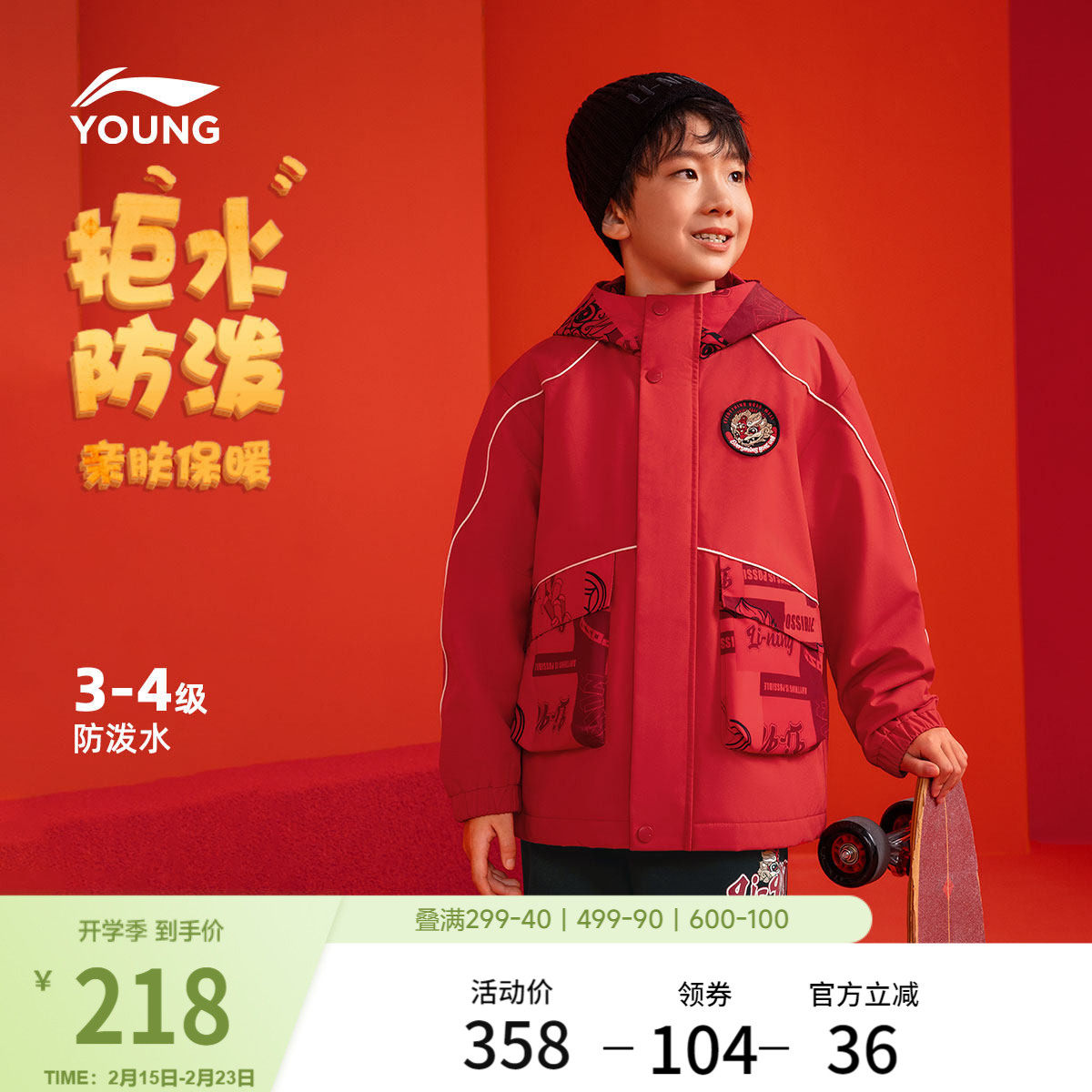 李宁加绒外套新款保暖本命年衣服男童装中大童女童装新年红色外套
