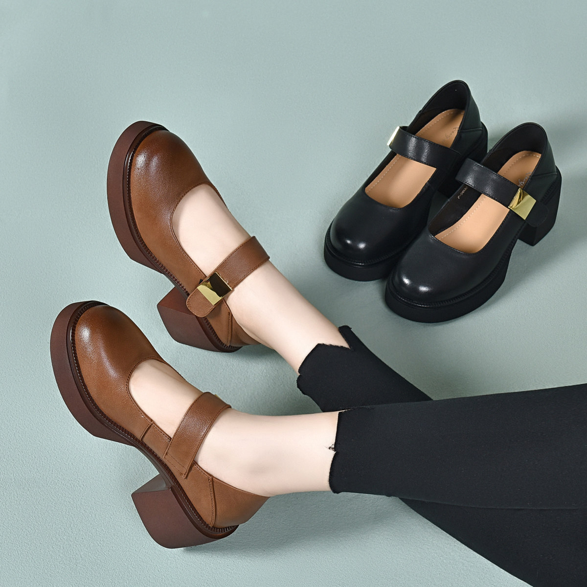 真皮粗跟厚底单鞋头层牛皮百搭女鞋春夏浅口软底黑色圆头中跟皮鞋